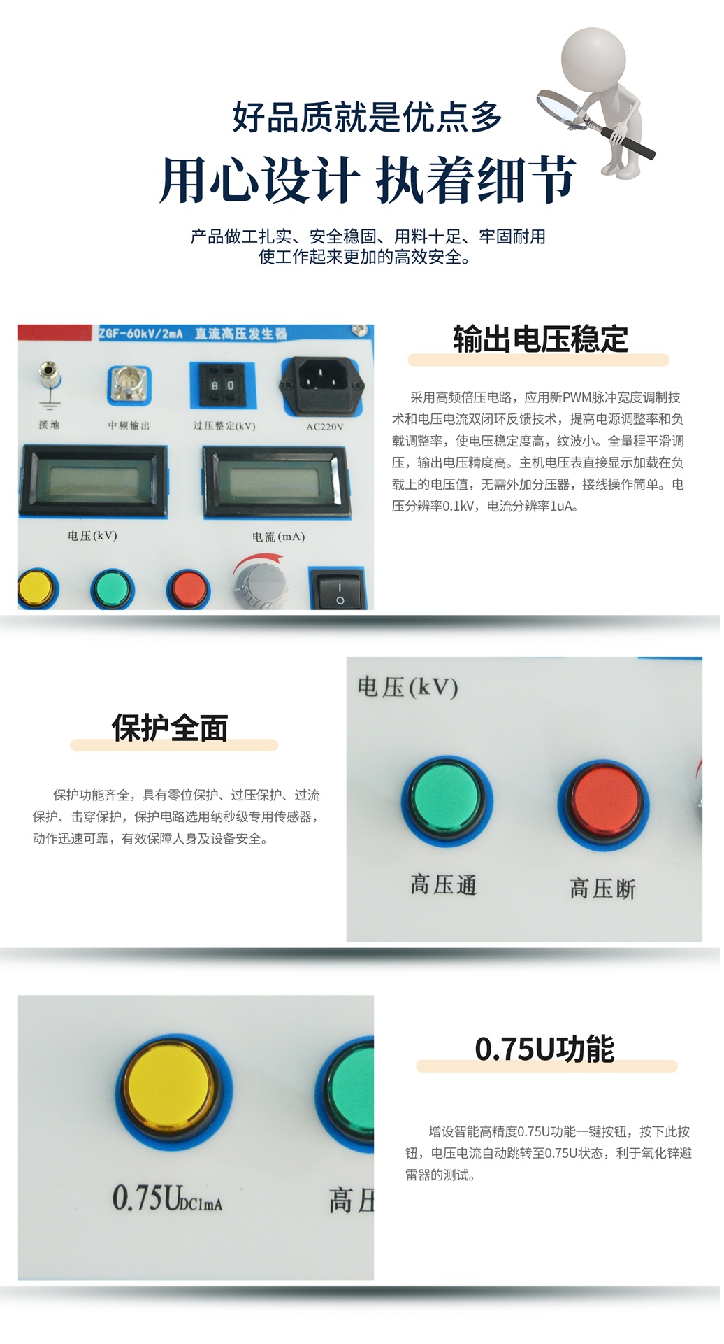 7、性能可靠:關鍵器件選用高性能進口元件,倍壓筒外表涂特種絕緣材料,電氣性能好、防潮能力強、無泄漏。